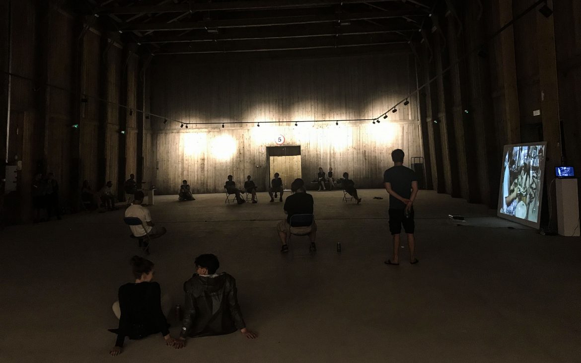 V radovednosti sprehajajočih turistov se izgubljajo tudi ljudje, ki so prišli na otvoritev 2. dela festivala IZIS namenoma. Leva vrata, ki odpirajo pot do instalacij so še zaprta. Poleg zvočnega tuša iznad njihovih glav opazijo v prostoru še dokaj veliko belo ploščo in dva glasbenika. Nekateri so prišli in videli začetek, drugi vstopijo v prostor pozneje, ko se v dogodek že vpletejo intervencije.